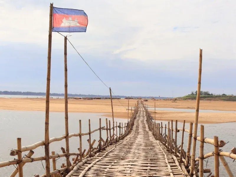 Journey to Kampong Cham to visit the ancient Wat Nokor and the unique Bamboo Bridge before continuing to Kratie. Experience authentic local hospitality on Koh Trong Island with a relaxing cycling tour.