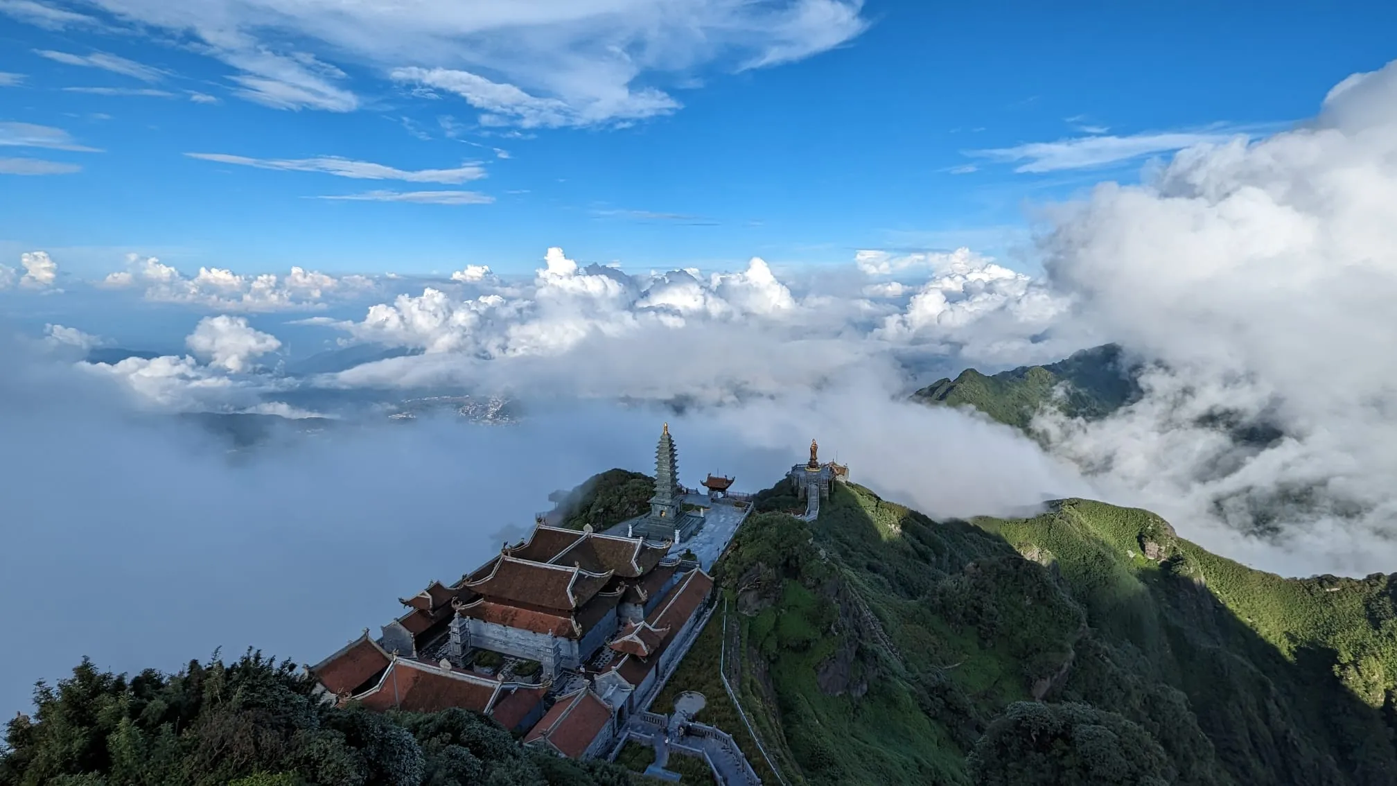 Sapa is one of the great Vietnam tourist destinations and for good reason. The rice fields receive much of the press and photographs and no problems with that. However, there is more. Vietnam has a couple great cable car rides. One is outside of DaNang and delivers one to the famous but overrated Golden Bridge and Ba Na Hills. The other is outside of Sapa and takes one to the roof of Indochina, Fansipan Mountain. The reward is an underrated Buddhist complex, built in 800 days and nights, and the highest point in Indochina. Be prepared for some wind and a cooler climate, maybe much cooler, than other Vietnamese locales. Wave a flag at 3,143 meters for us.